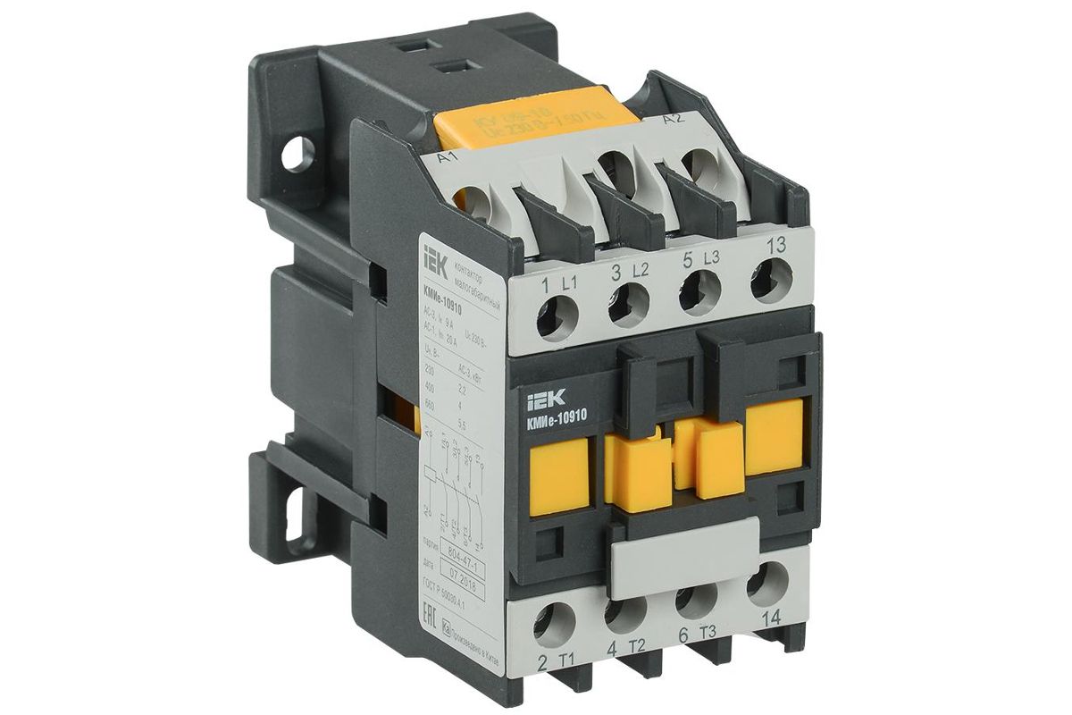 Контактор КМИе-10911 9А 110В/АС3 1НЗ IEK KKME11-009-110-01 Малогабаритные контакторы серии КМИе на ток нагрузки от 9 до 95 А предназначены для пуска, остановки и реверсирования асинхронных электродвигателей с короткозамкнутым ротором на напряжение до 660 В (категория применения АС-3), а также для дистанционного управления цепями освещения, нагревательными цепями и различными малоиндуктивными нагрузками (категория применения АС-1).